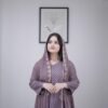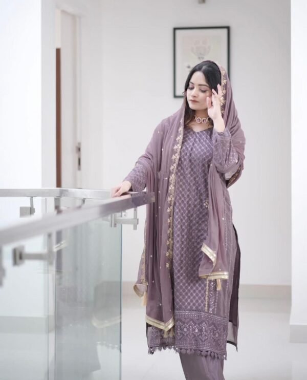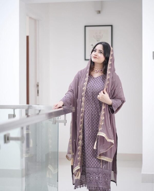 The luxurious silk bottom, tailored to a length of 38 inches and a waist up to 38 inches, adds a smooth, opulent contrast, grounding the ethereal top with classic sophistication. Draped over the shoulders is a sheer georgette dupatta, fully embroidered to echo the kurti’s charm, flowing with every step like a dream.