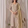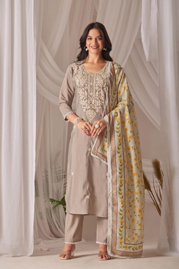 Auvoria Chanderi Silk Chikankari Kurti Set with Digital Printed Dupatta – Elegant Beige