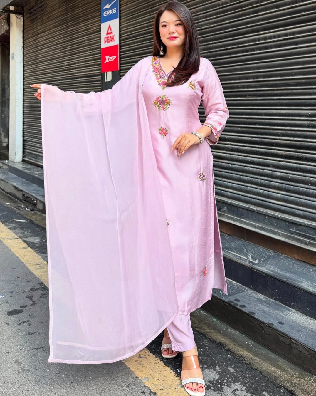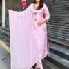 Grace every moment with the elegance of Auvoria’s Contemporary Viscose Chanderi Suit Set—a perfect blend of tradition and modernity for the discerning woman. The kurti crafted from soft viscose chanderi extends to 45 inches, its embroidered motifs bringing tender artistry to life. Designed to fit bust sizes up to 44 inches with a full inner lining, it promises comfort and confidence. Tailored matching bottoms offer a graceful fit for waists up to 38 inches and lengths between 37 and 38 inches, ideal for effortless elegance. The exquisite 2.20-meter Najmeen dupatta, fashioned from delicate fabric and adorned with digital embroidery, completes this ensemble with a flourish. Celebrate your unique story with Auvoria, where heritage and style become one.