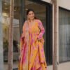 Step into the splendor of midnight elegance with Auvoria’s Midnight Majesty Anarkali Suit—a perfect fusion of grace, tradition, and modern charm. The 48-inch kurti, crafted from luxurious silk chinon, features a captivating all-over print that exudes sophistication, while the plain chanderi bottom offers a clean, elegant contrast.