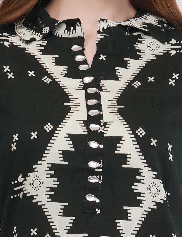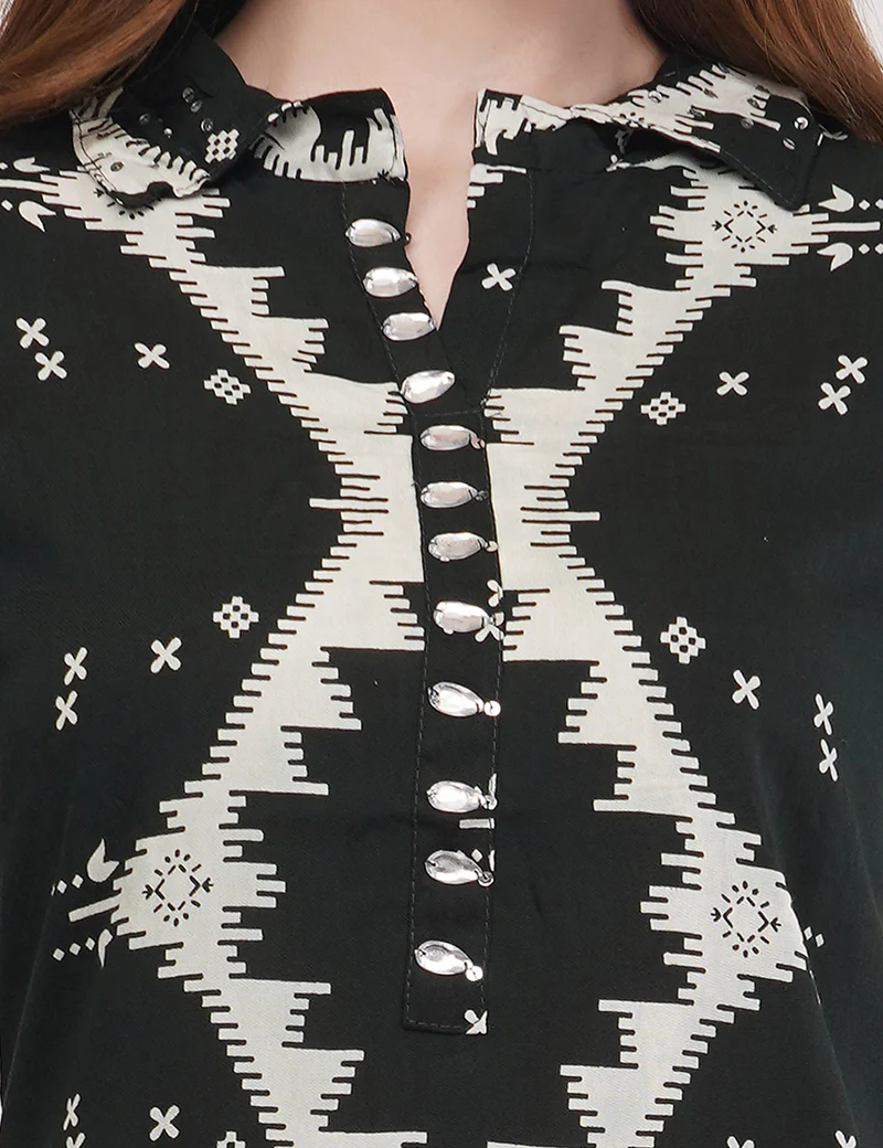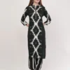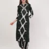 The kurta features a striking black-and-ivory Ikat-inspired geometric pattern, creating a bold visual rhythm that instantly stands out. The minimal yet elegant button placket adds a refined touch, balancing traditional artistry with contemporary style.