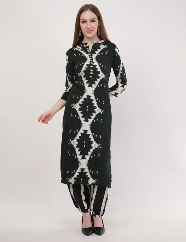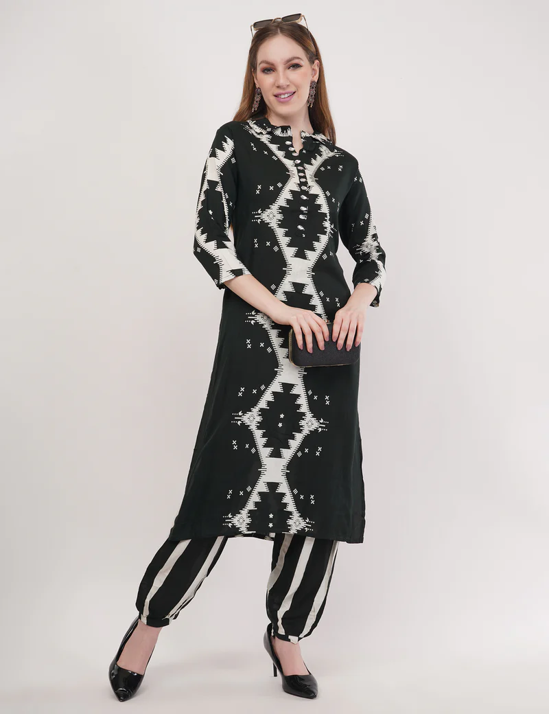 Paired with striped bottoms that complement the kurta’s pattern, the set brings a unique fusion of symmetry, contrast, and individuality—perfect for women who love outfits that speak confidence without being loud.