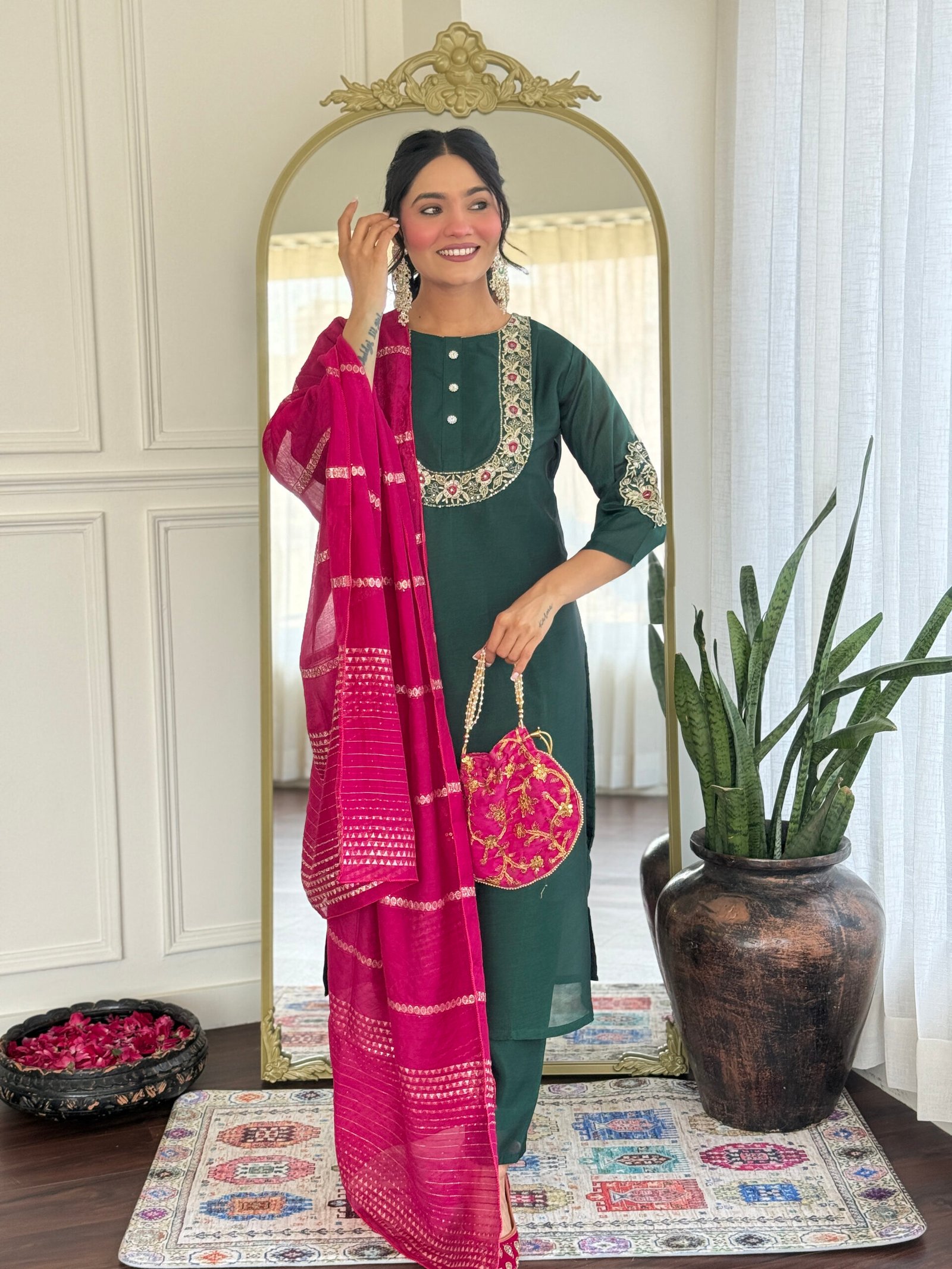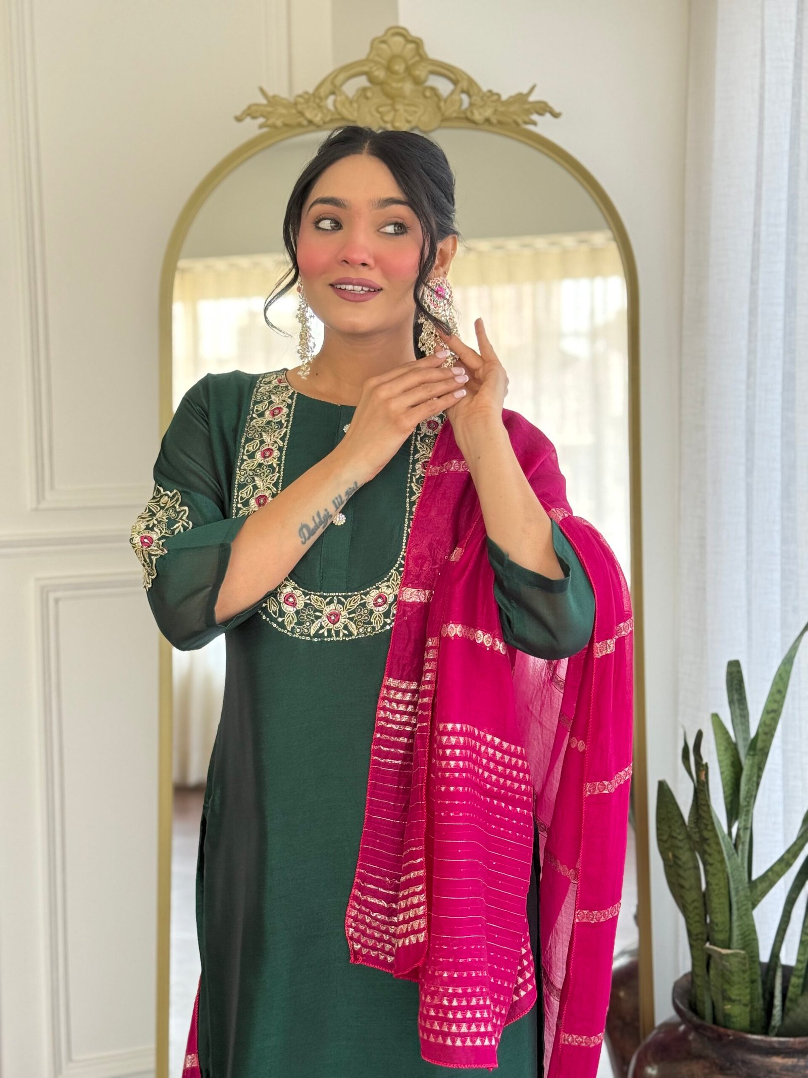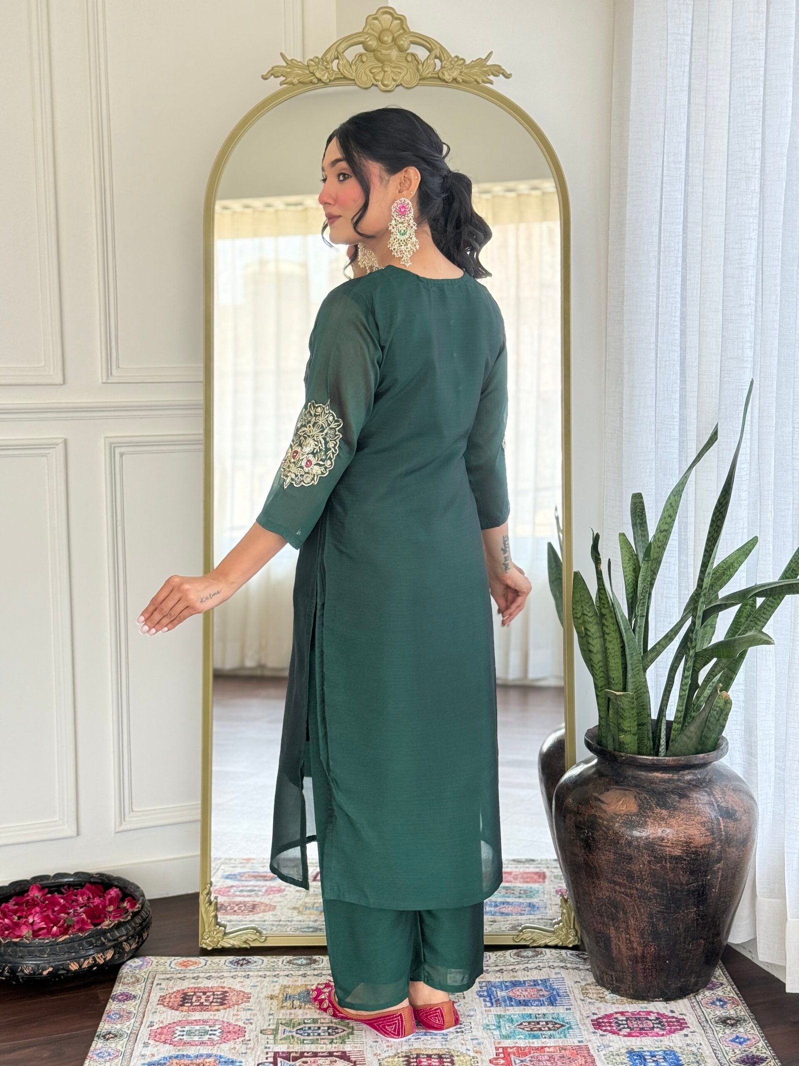 Paired with the kurti are perfectly tailored chanderi bottoms designed to fit waists up to 38 inches and lengths between 37 to 38 inches, offering a blend of style and ease.