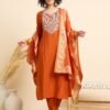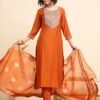 Women Embroidered Straight Orange Kurta And Pant set with Dupatta